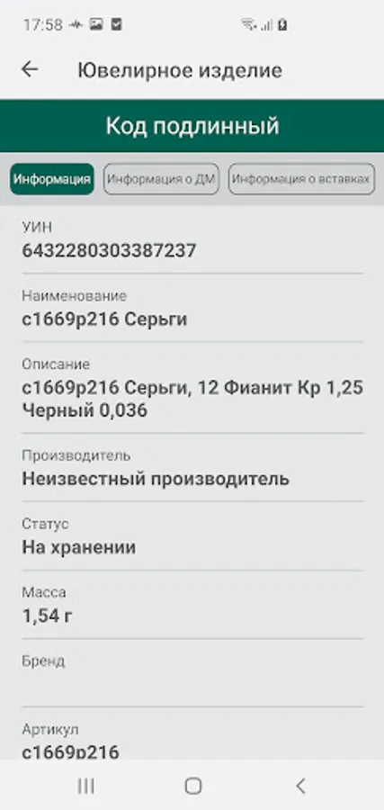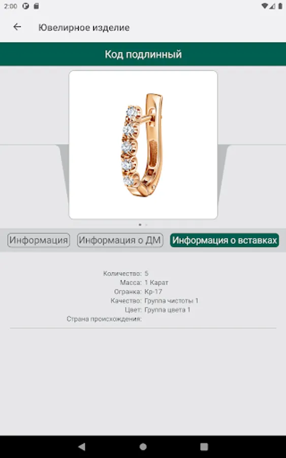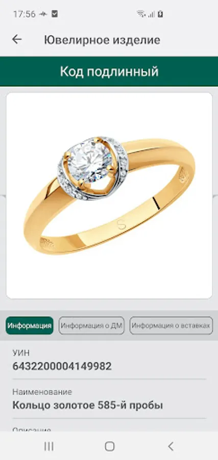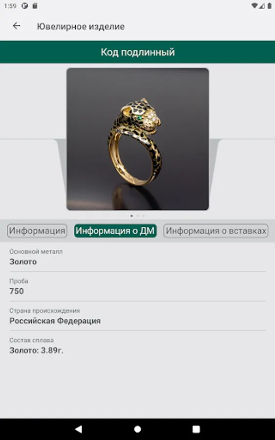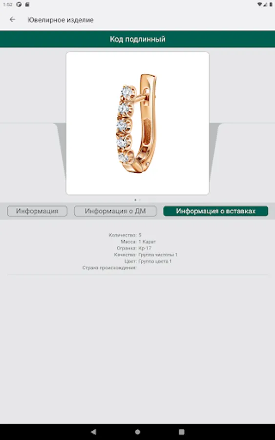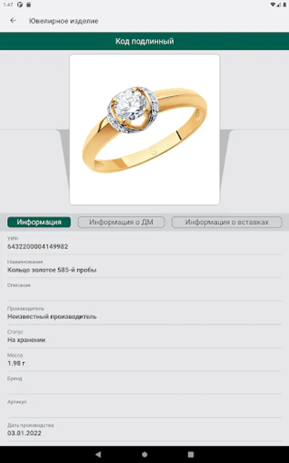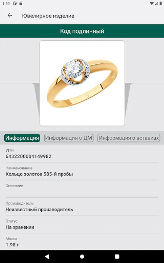 To get information about a piece of jewelry, it is enough to scan a barcode containing a unique identification number (UIN) from the tag of a piece of jewelry. By comparing the information received with the information on the product tag, you can be sure that you have a genuine product.
