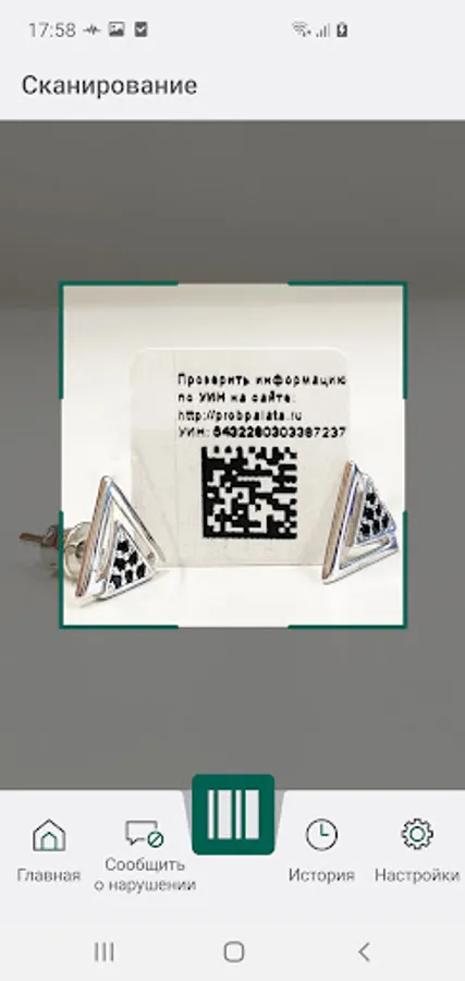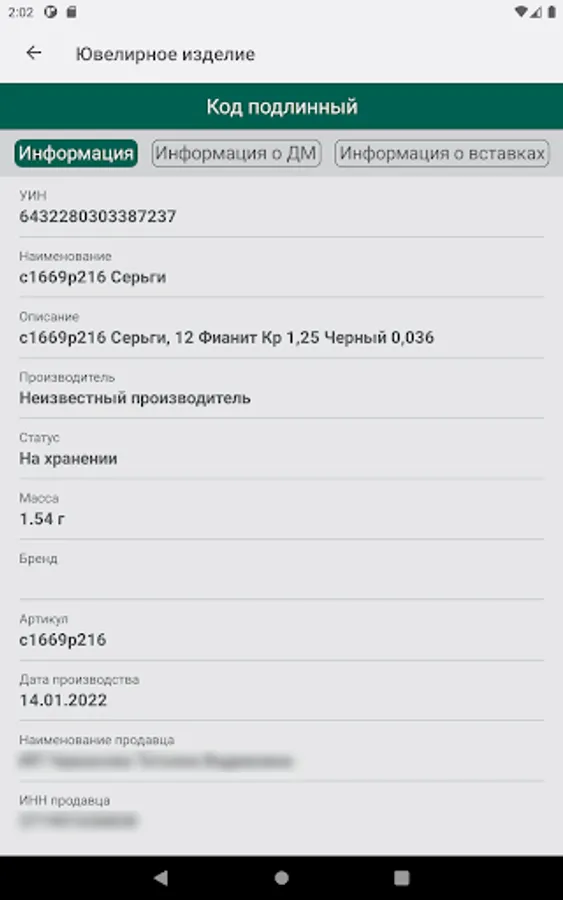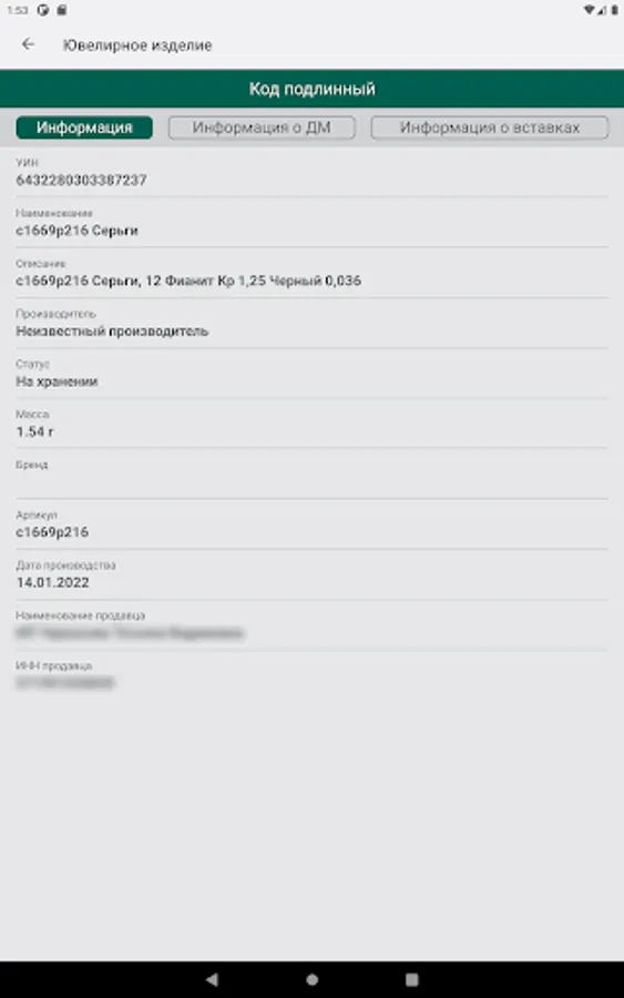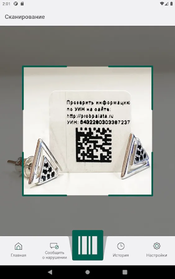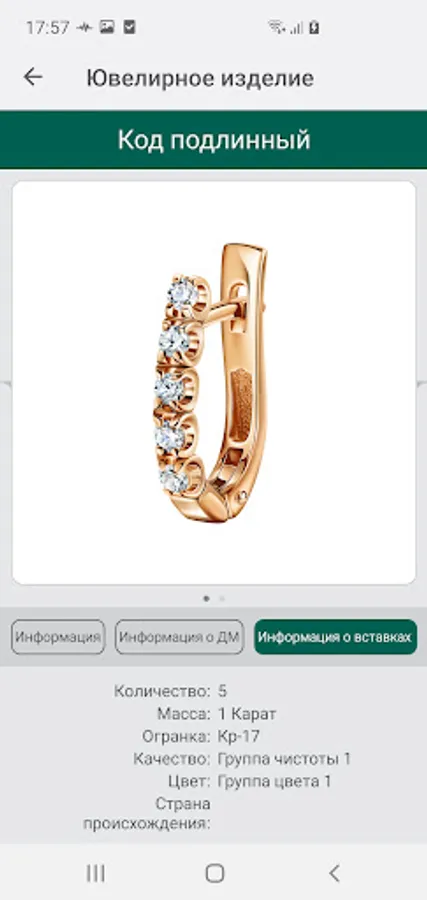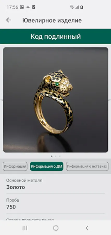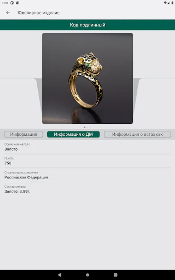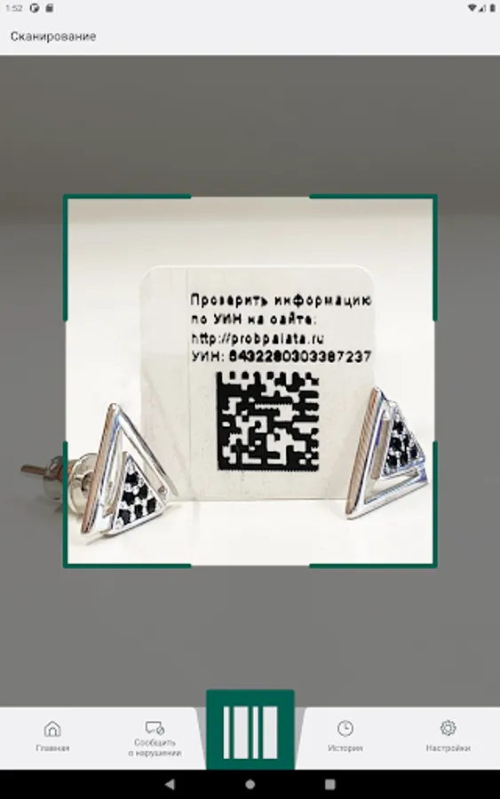 To get information about a piece of jewelry, it is enough to scan a barcode containing a unique identification number (UIN) from the tag of a piece of jewelry. By comparing the information received with the information on the product tag, you can be sure that you have a genuine product.