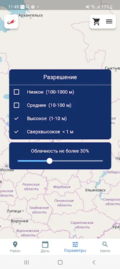 • order a product based on an existing image, specifying the parameters of interest (image fragment, spectral channels, number of bits per pixel, map projection, and others);