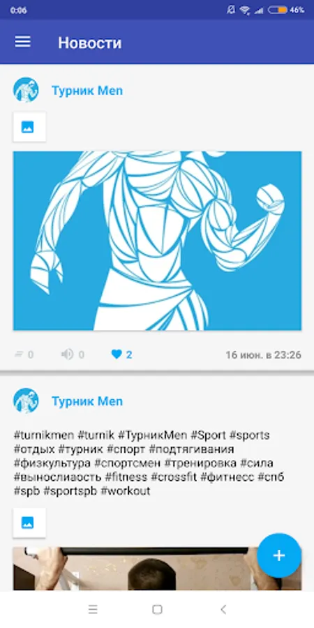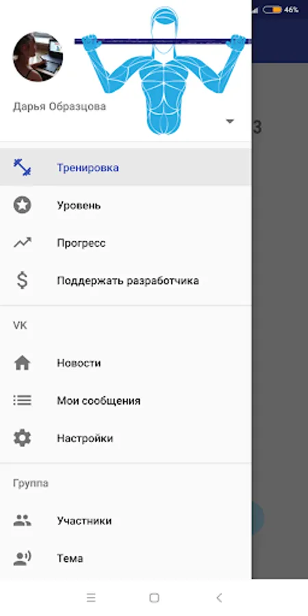 The application can be accessed through a VK account. Then the group of this application will be visible where you can upload your workout results on the wall. Leave comments and likes to other members of the group.