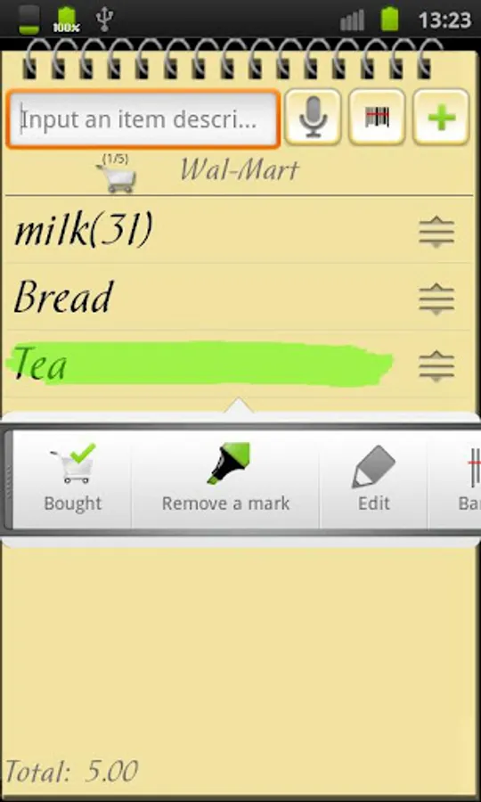This is useful and simple way of making out a shopping list on your phone. You can input items from keyboard, add from database, filled by you, by barcode scanning and even using your voice! Also, you can mark out important purchases in the list. You just have to tap an item to mark it as "bought".