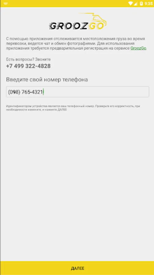 The application for drivers can be used by drivers registered with the carrier on the GroozGo website. Device Id = driver phone number in the format 1234567890 (three-digit code + seven-digit number). The same phone number is indicated on the driver’s card in your account on the GroozGo website.