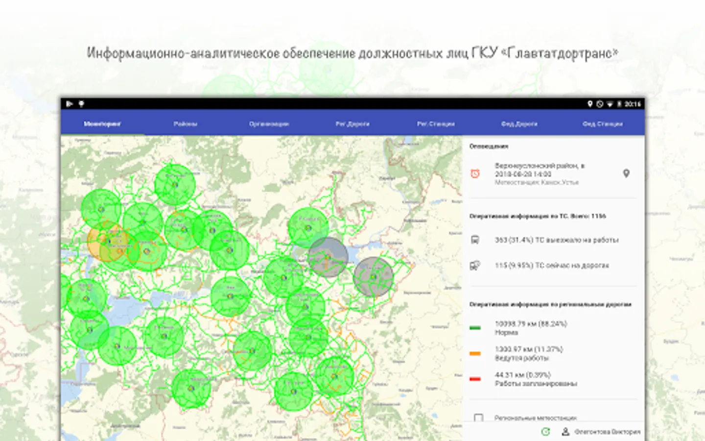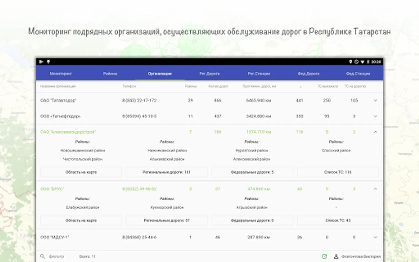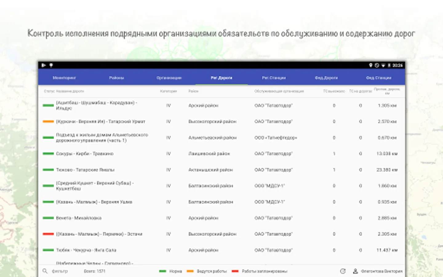 Mobile instrument for automation of organizational processes of the State Institution "Glavtatdortrans" for monitoring contractors that provide road maintenance in the Republic of Tatarstan. The application helps to control the performance by contracting organizations of the SCU "Glavtatdortrans" of the obligations to maintain and maintain roads in the Republic of Tatarstan. The mobile application was created for the purposes of information and analytical support to the officials of the State Customs Committee "Glavtatdortrans" and the Ministry of Transport of the Republic of Tatarstan and to improve the quality of organizational processes related to monitoring the fulfillment of obligations of the contractors of the State Customs Committee "Glavtatdortrans" for servicing roads in the Republic of Tatarstan and increasing the transparency of these organizational processes.