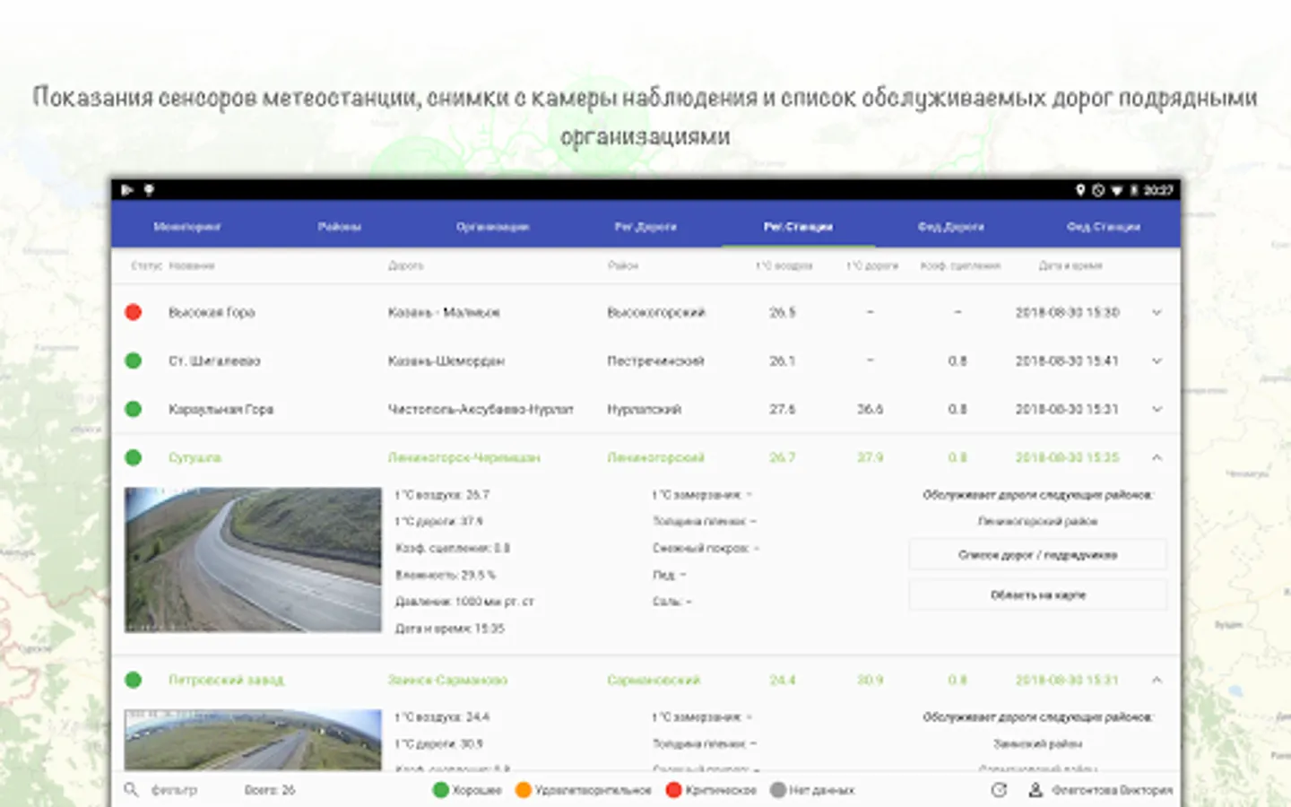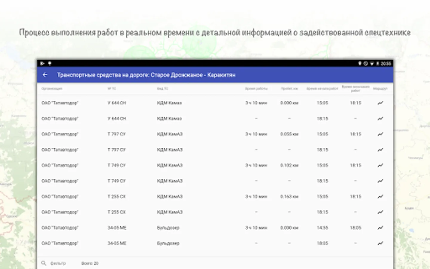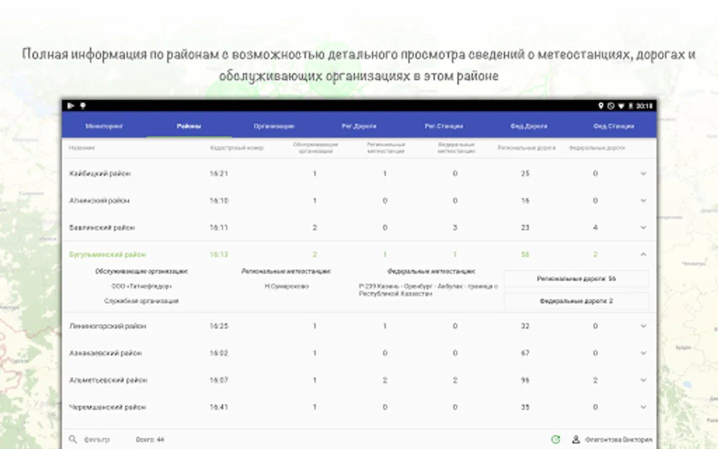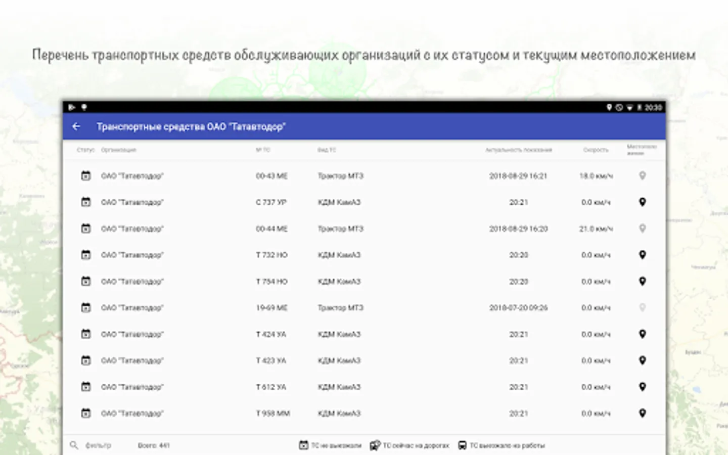 Mobile instrument for automation of organizational processes of the State Institution "Glavtatdortrans" for monitoring contractors that provide road maintenance in the Republic of Tatarstan. The application helps to control the performance by contracting organizations of the SCU "Glavtatdortrans" of the obligations to maintain and maintain roads in the Republic of Tatarstan. The mobile application was created for the purposes of information and analytical support to the officials of the State Customs Committee "Glavtatdortrans" and the Ministry of Transport of the Republic of Tatarstan and to improve the quality of organizational processes related to monitoring the fulfillment of obligations of the contractors of the State Customs Committee "Glavtatdortrans" for servicing roads in the Republic of Tatarstan and increasing the transparency of these organizational processes.