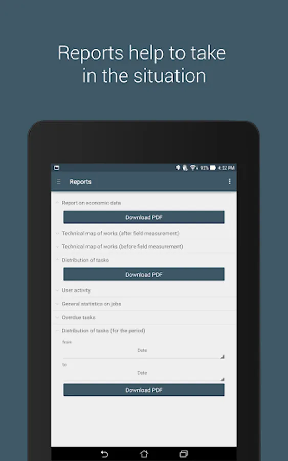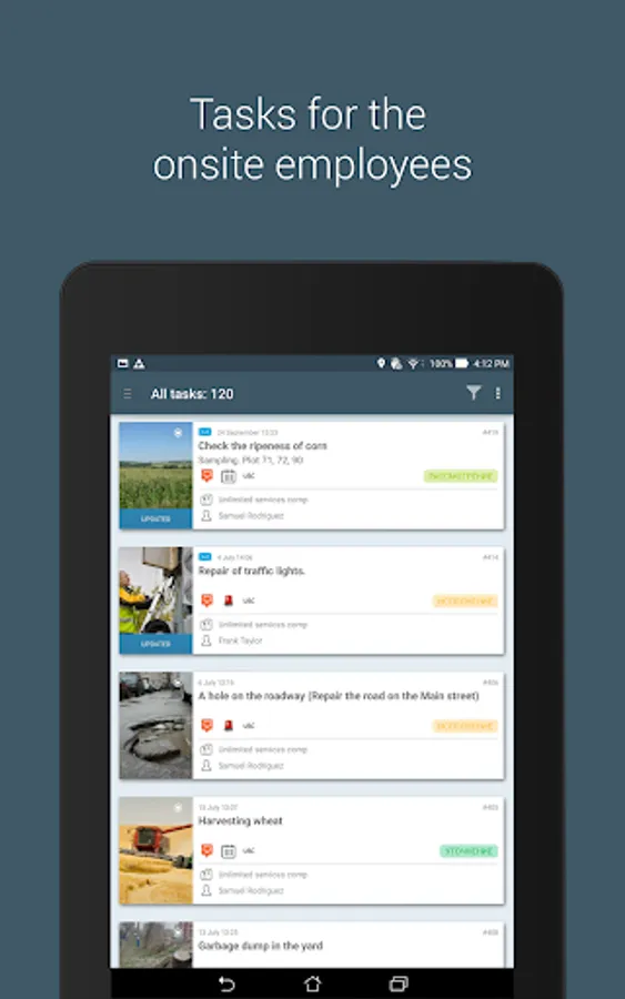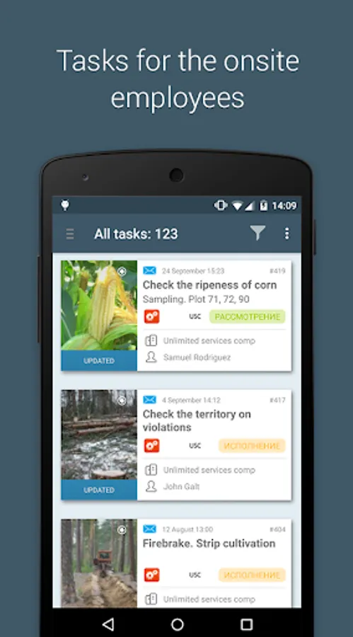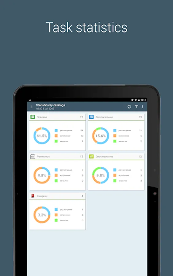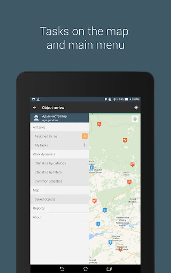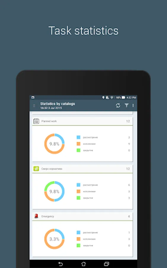 Tasks. The mobile workers receive the tasks through the program. The dispatcher sends the tasks and monitors the work process. Prompt task setting increases the mobile team efficiency.