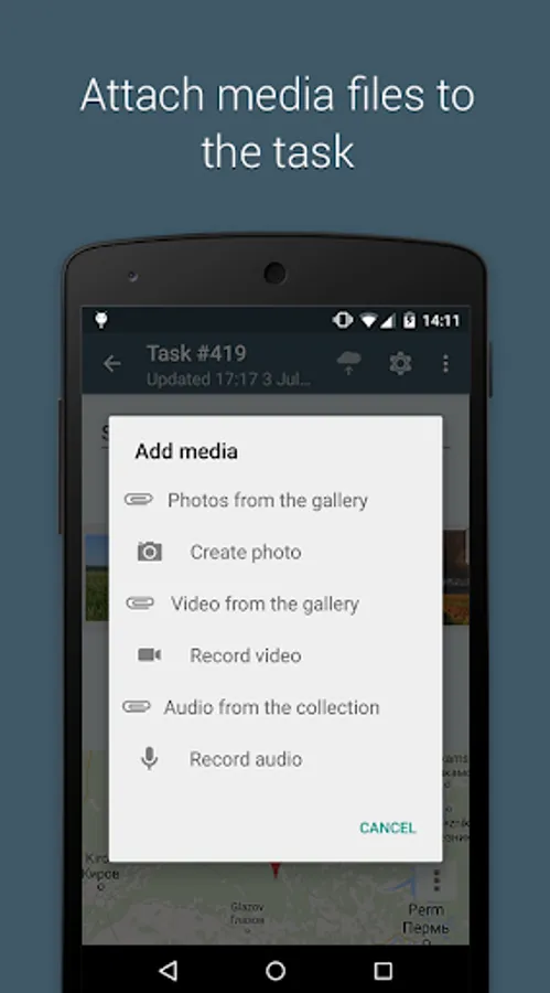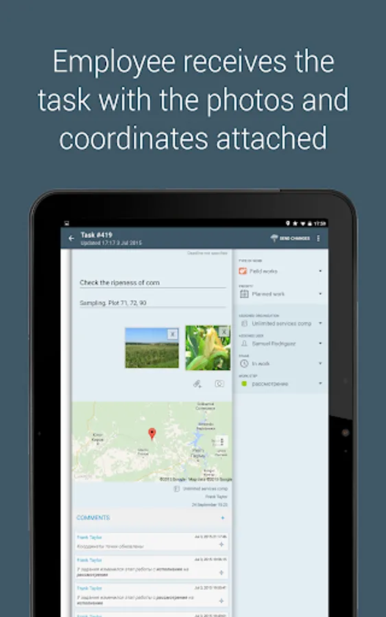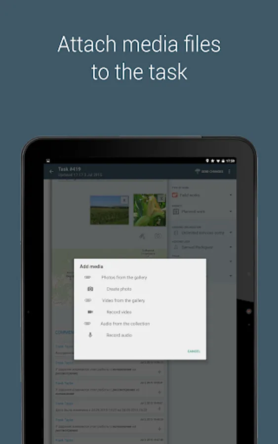 Data collection in the real time mode. The workers send photos and video from the work scene to the dispatcher. The files are georeferenced and show where the shot was made.