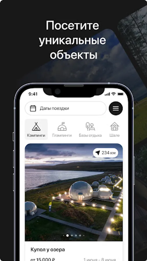 Mobile application with a single database of glampings, campsites and databases throughout Russia.