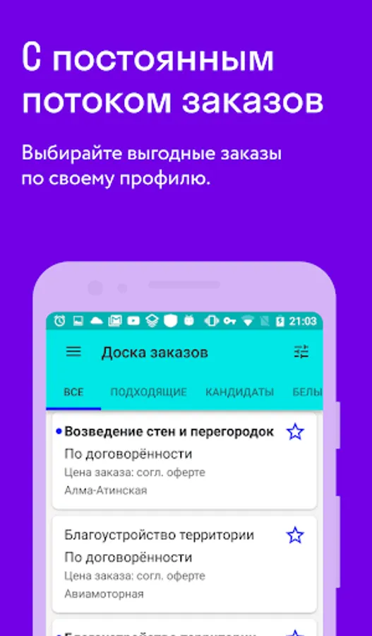 Our application is a great alternative to services of vacancies for masters and ads "I'm looking for a job / I offer services." At the same time, you can work here and fulfill orders both on a permanent and periodic basis.
