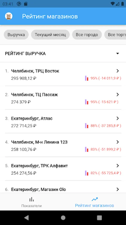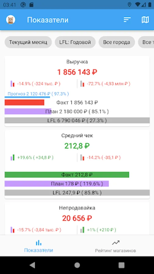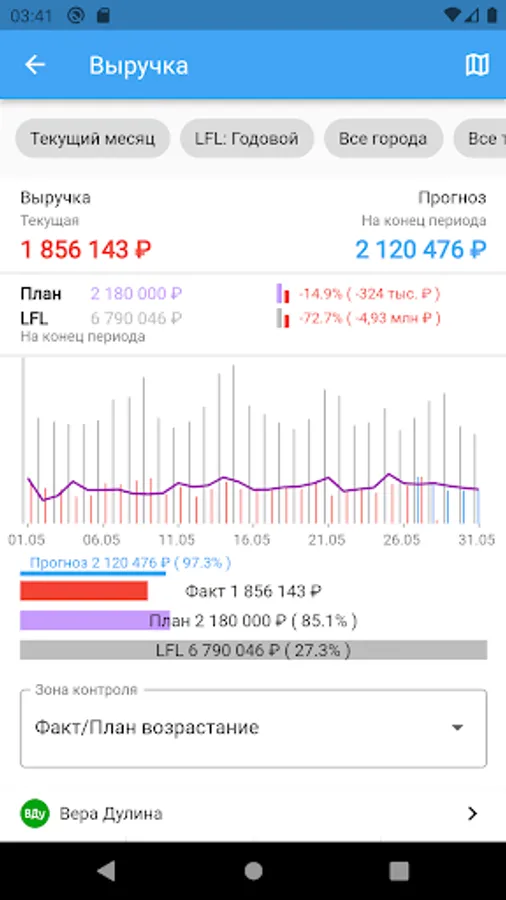 You can choose the desired period for viewing sales data, set the visibility of data across the entire network, regions or outlets. Dive into the personal sales of employees and see performance indicators for sellers!