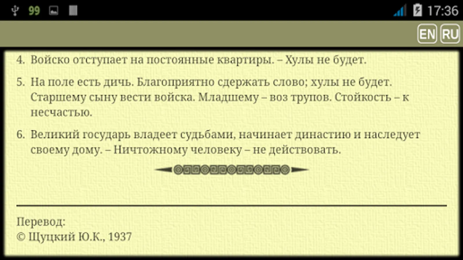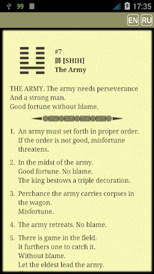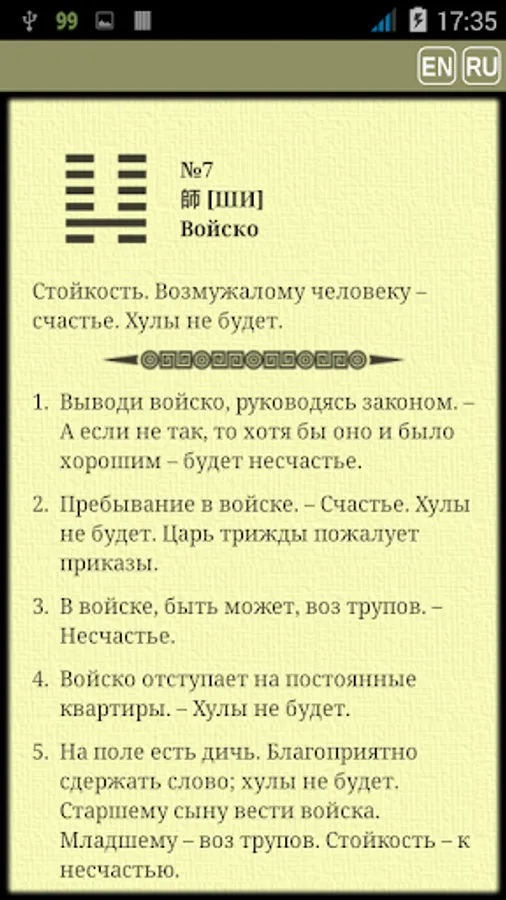 Click on widget opens the window with hexagram description with general and by-line comments.