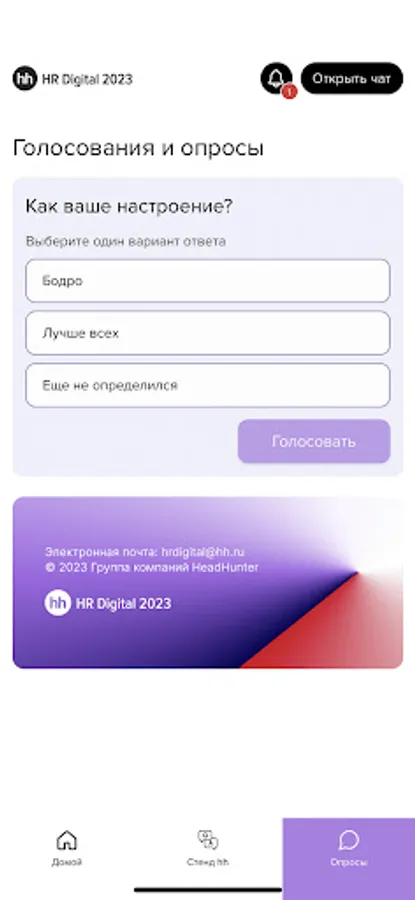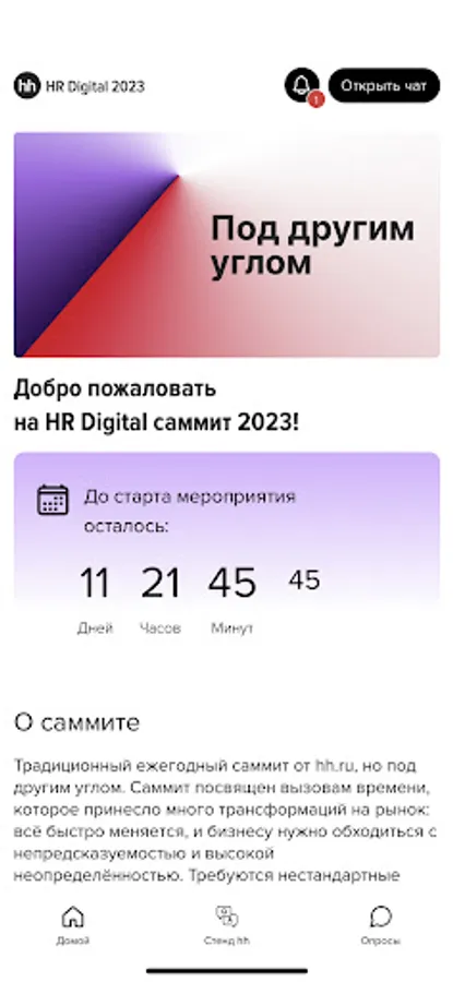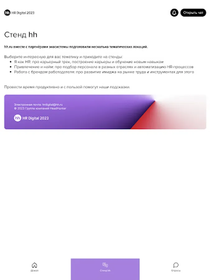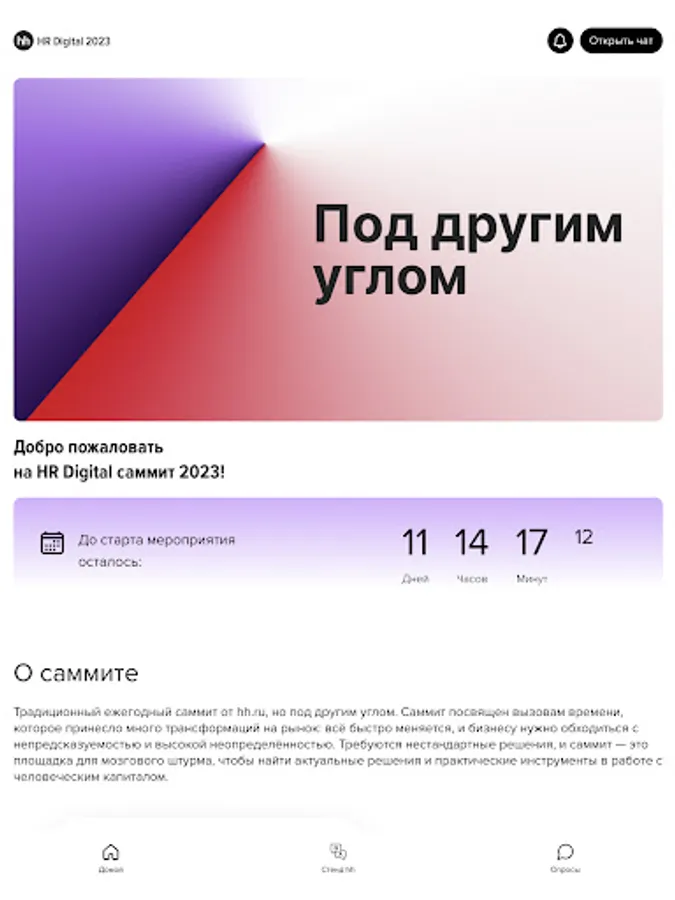 A free application developed specifically for participants of the HR Digital Summit 2023 event. The application provides the opportunity to receive real-time information about all events of the event, about the program, provides feedback from organizers and speakers, and also gives access to various interactive features.