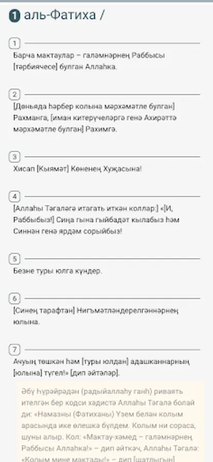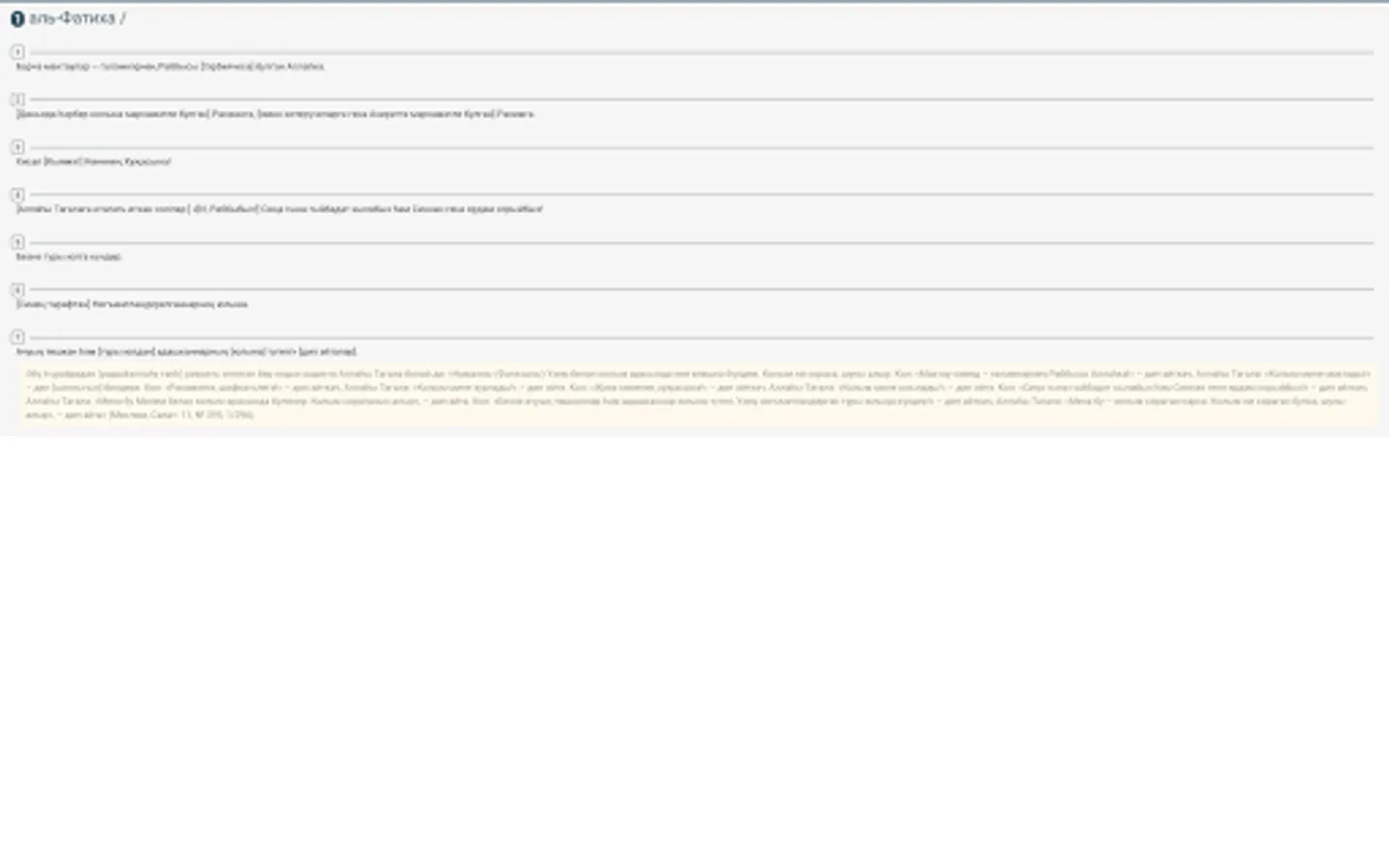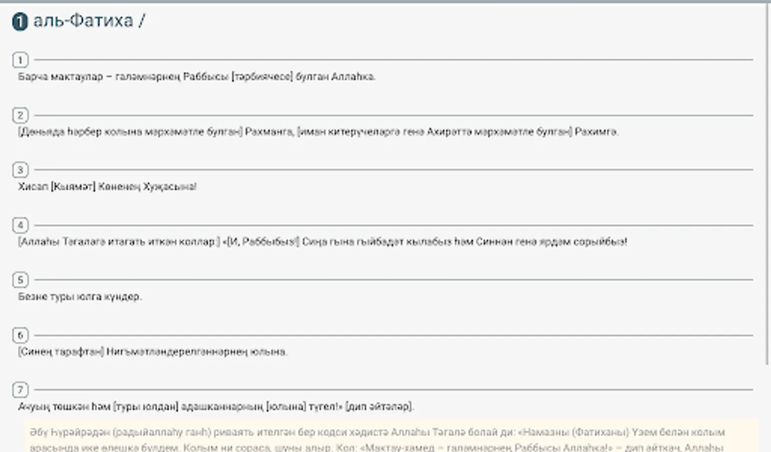 For the convenience of the reader and to make it easier to understand the meanings of the Qur'an, the text of the work contains comments separated by brackets from the literal translation. Thus, the transcription of the Kur'an into the Tatar language in a variation of the SAM RT allows to convey to the reader not only its literal meaning, but also the historical cultural background on which the text of the Noble Book was recorded and pronounced, the nuances, subtexts and metaphors of the Kur'an language.