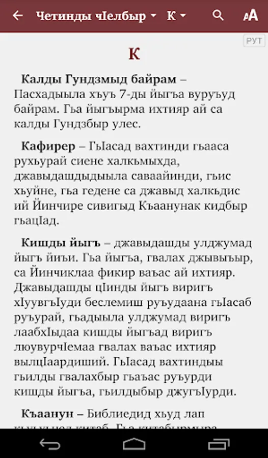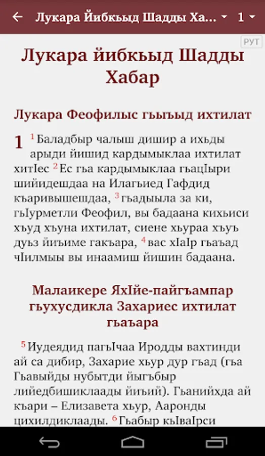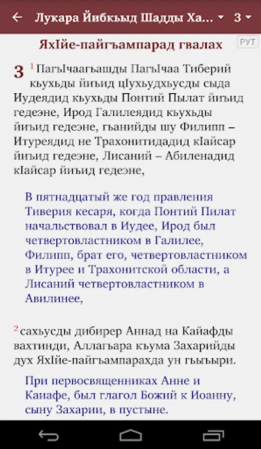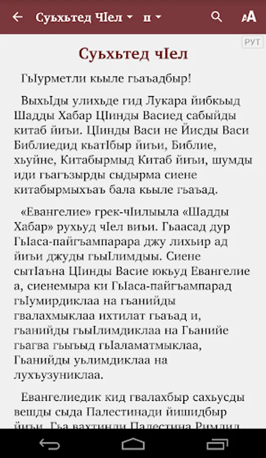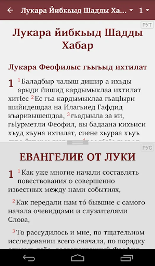 It facilitates the offline study of the Scriptures in Rutul. It also contains the Russian Synodal translation, which can optionally be displayed in parallel. Users can highlight verses in different colors, place bookmarks, write notes and view the reading history.