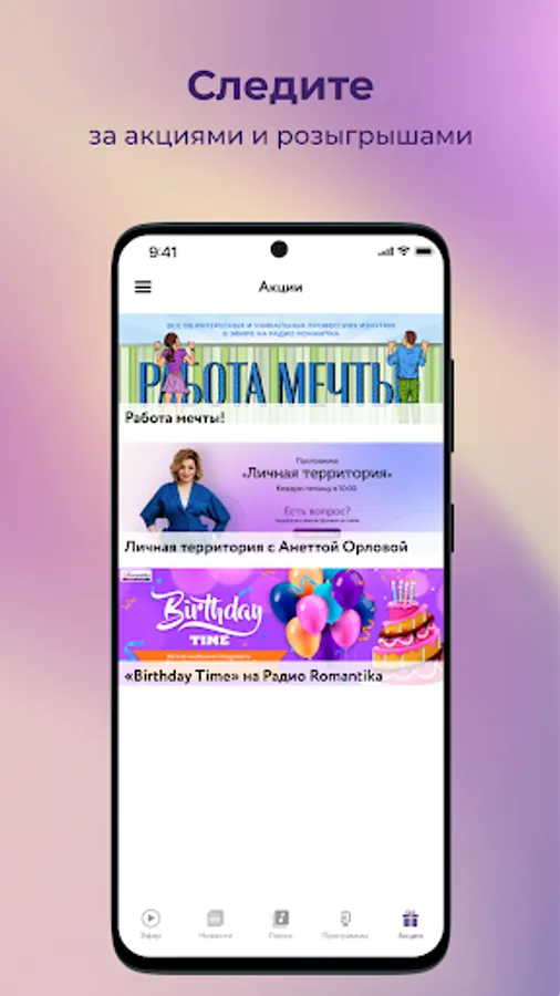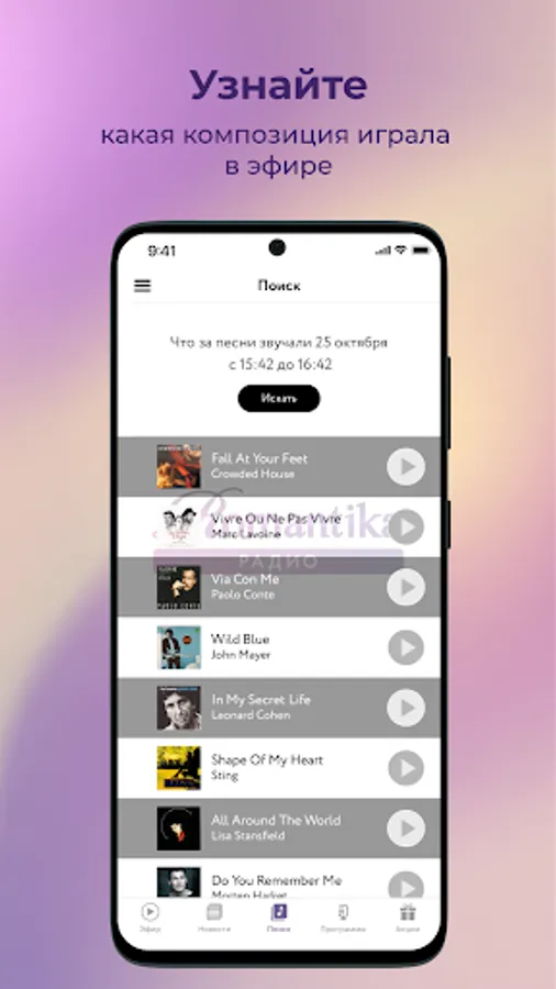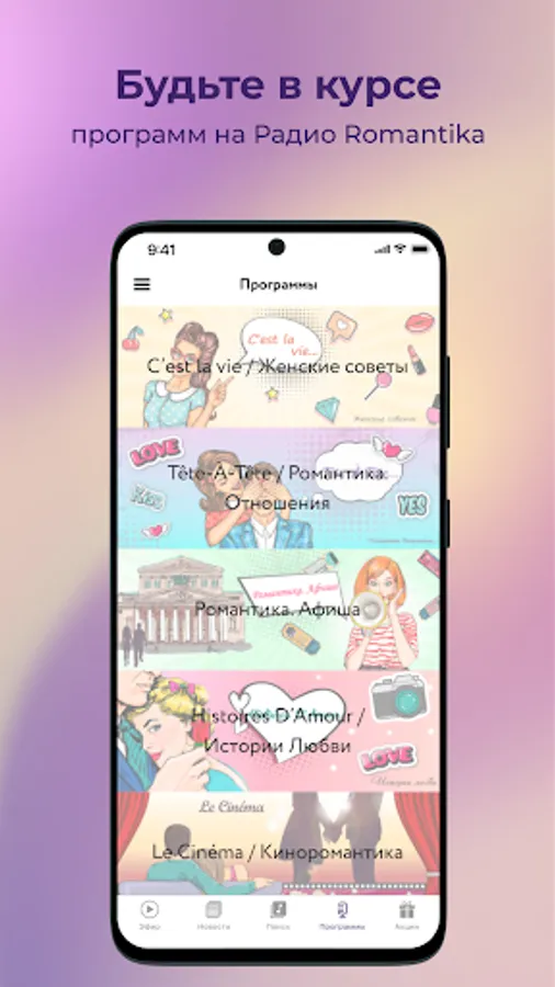 The radio station is a source of feelings and inspiration to all "romantics" of our time, for a successful and accomplished people living in step with the modern pace of life, appreciate the enduring values of life. Carefully selected music creates in the listener a positive, elevated mood.