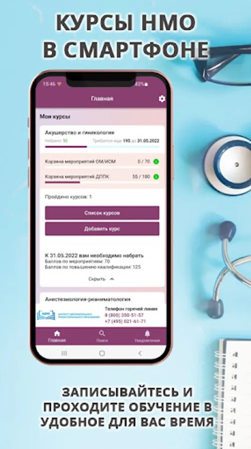 Received NMO points are available for user control. Based on this, you can make a list of required courses for a particular specialty and track the training already completed.