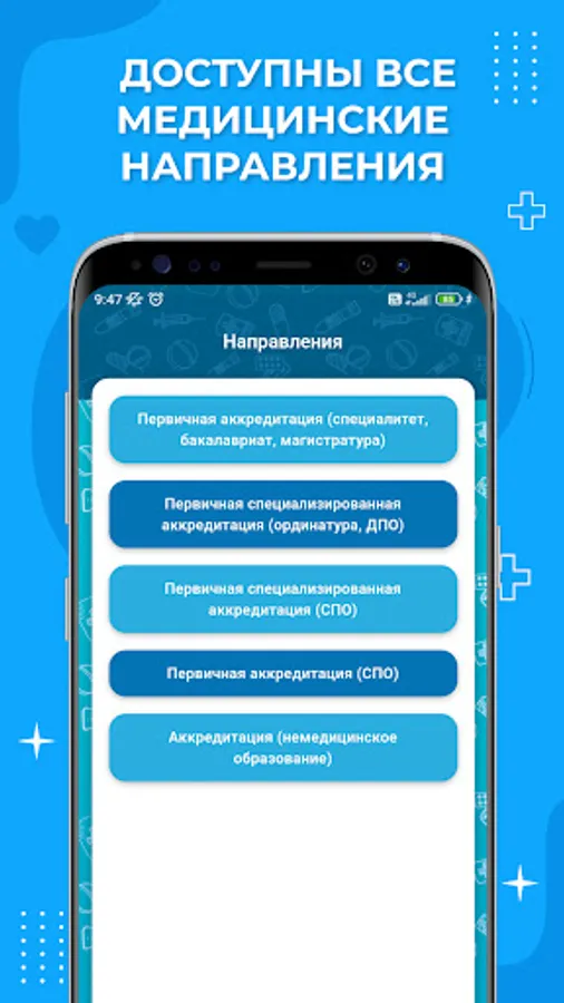 The application "IDPO - Accreditation 2023" is a convenient tool for preparing for accreditation tests and successfully passing exams for medical professionals, including doctors and SMPs (middle medical personnel). With the application, you can get acquainted with the test questions that are relevant for 2023 in such areas as General Medicine, Pediatrics, Dentistry, Pharmacy, Medical Preventive Care, Medical Biochemistry, Medical Biophysics, Medical Cybernetics, Psychiatry-Narcology, Preventive Dentistry, Pharmacy and many others