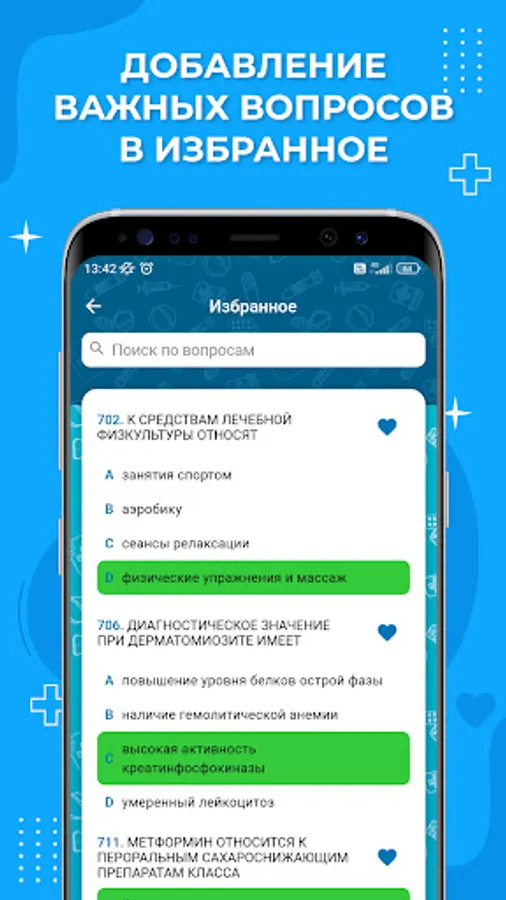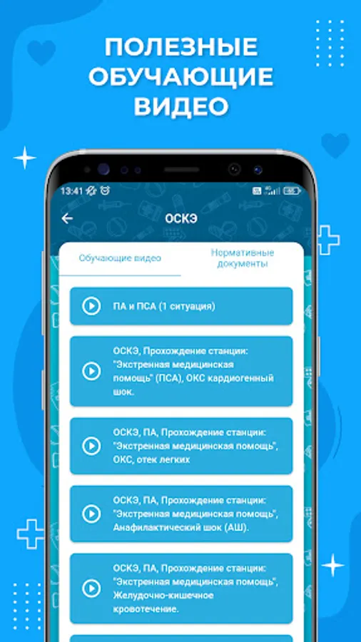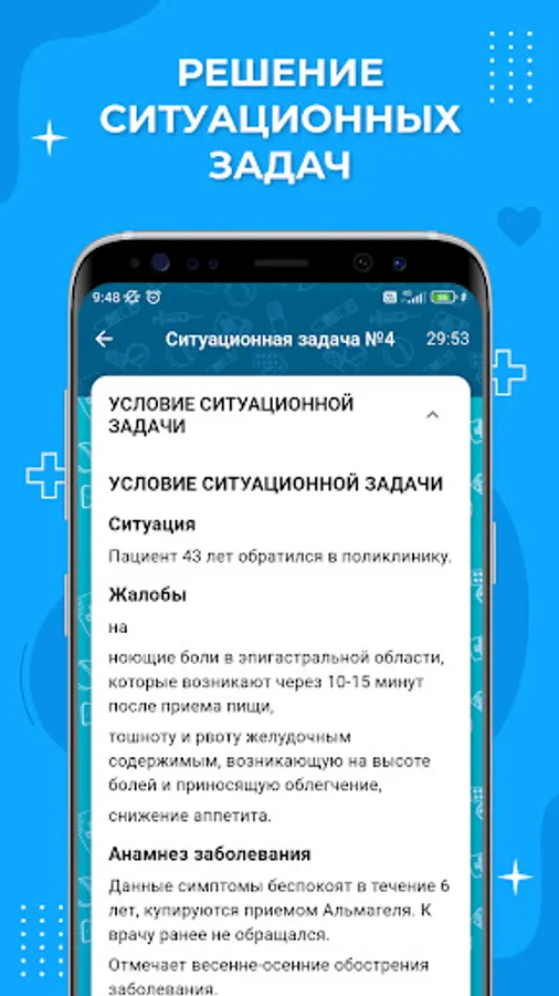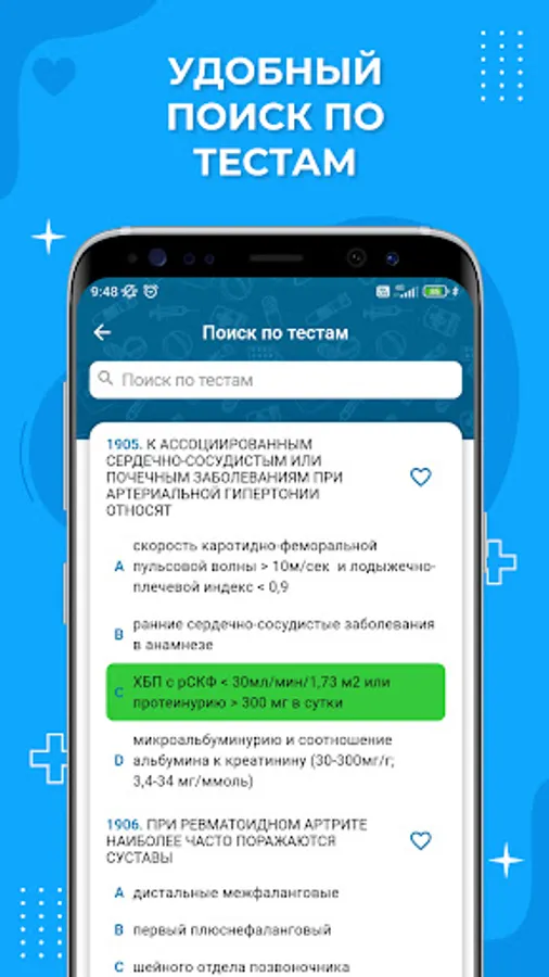 The functionality of the application provides an opportunity to get acquainted with tests for doctors and SMPs, training and control testing, solving clinical problems, tracking the level of readiness and viewing video content and regulatory documents in various specialties.