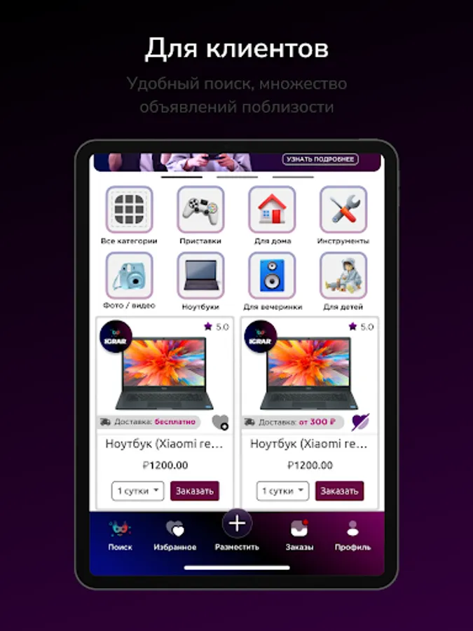 Our platform brings together partners and clients in one place where you can view the entire range of rentals, based on reviews and ratings, and the loyalty system will delight you with promotions and discounts.