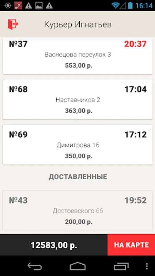 • Automatic calculation of the optimal route and demonstration of it to the courier using the Yandex.Navigator application