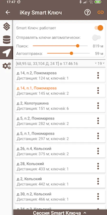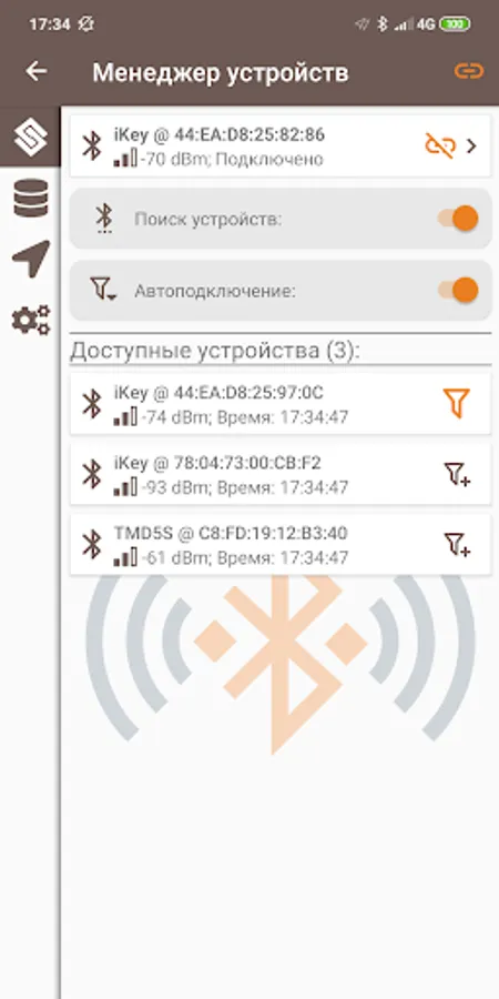 To work with devices, launch the application and connect to the device. No pairing required. If the app does not connect to the device, check the location is enabled. The program does not use geolocation outside of the Smart Key function, but it is so arranged in Android that blocking geodata blocks Bluetooth scanner. If the application still does not connect, turn off Bluetooth, uninstall the application, install it again and launch it. Answer yes to the question "allow the application to turn on Bluetooth".