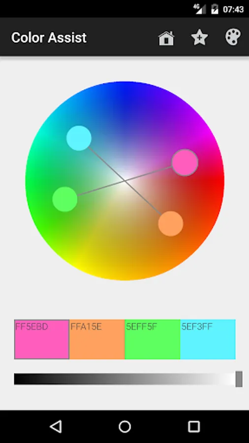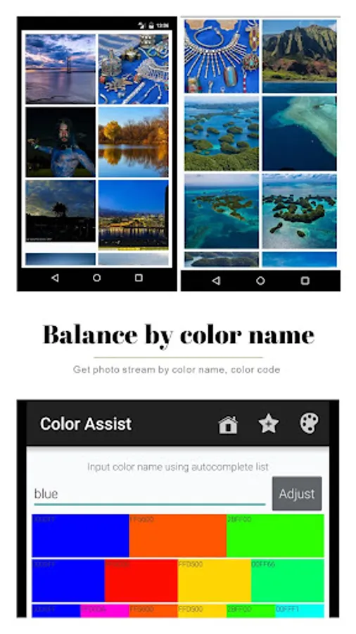 Color balance is based on Color Harmony Rules: triade, tetradic, split complementary, complementary, 6 intermediate colors, monochrome, analogous.