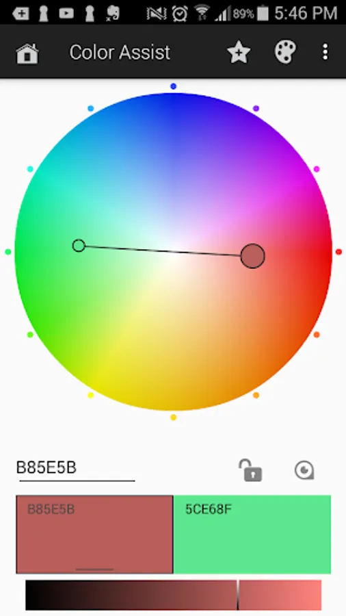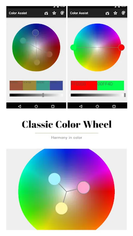 This is your handy, interactive Classic Color Wheel(basic colors: red, yellow, and blue). The best functions for finding harmonious color combinations are now available in one application.