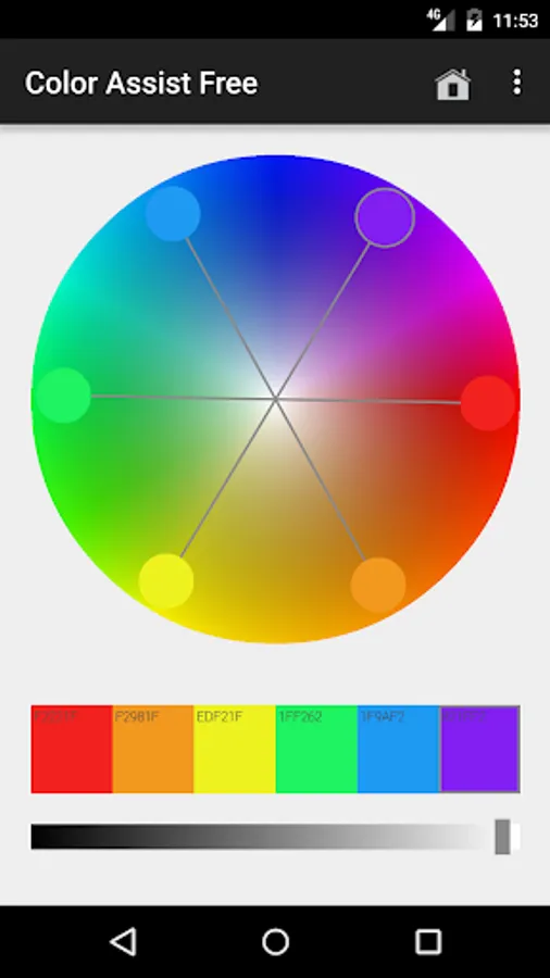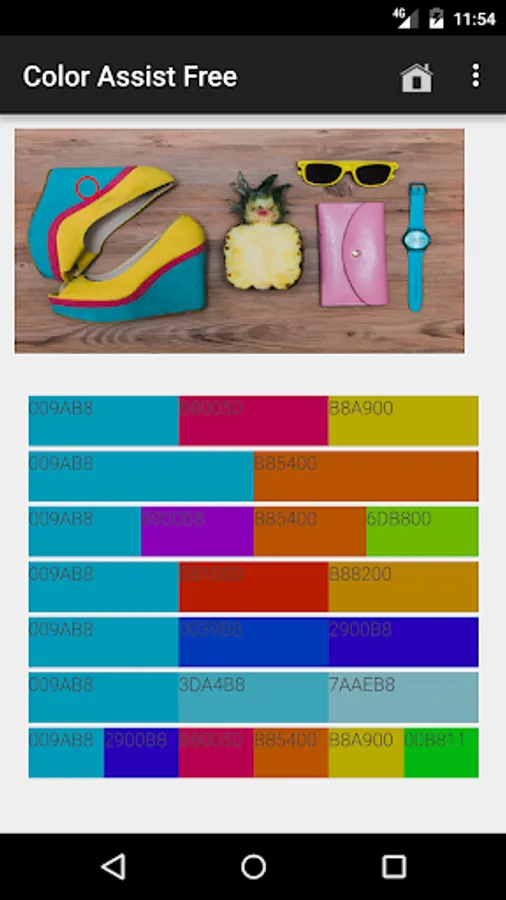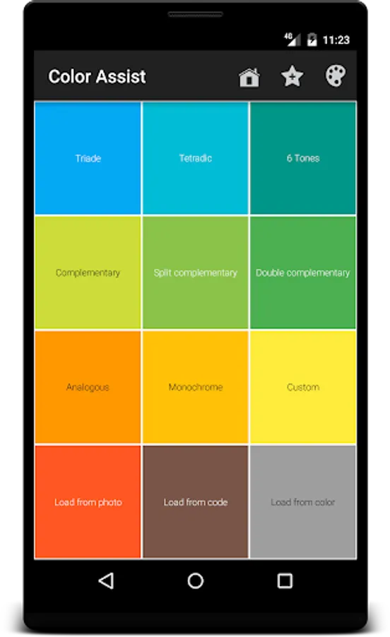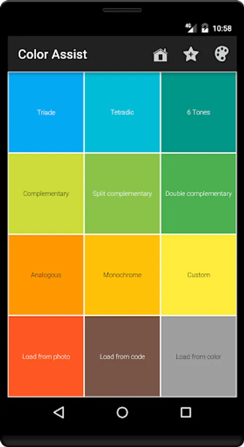 The application helps to define a balanced color combination with Color Harmony Rules: triad, tetrad, contrast, analogous, harmonious combination, split-complementary, 6 intermediate colors.