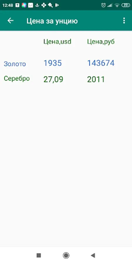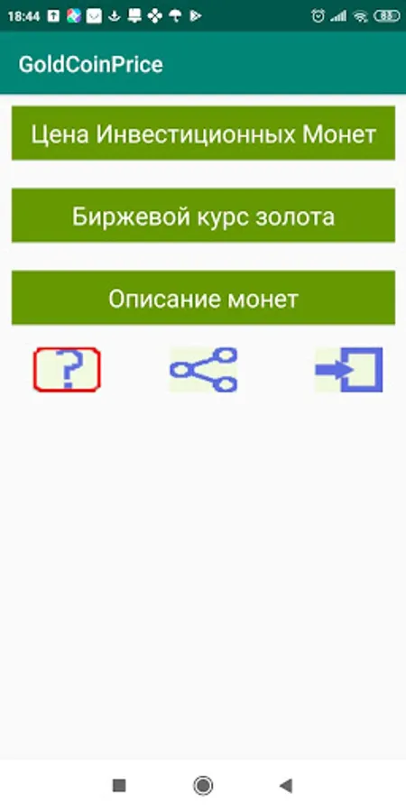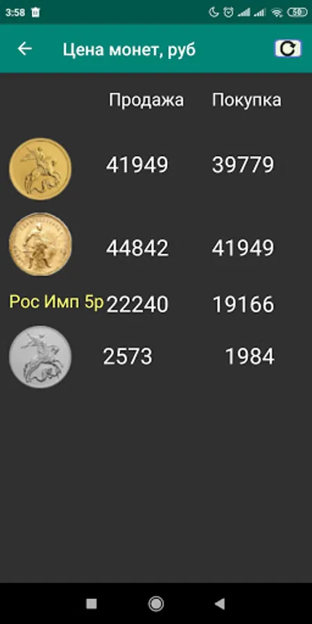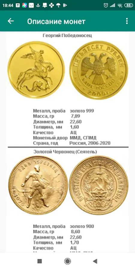 The application is informational, displays the current prices for investment gold coins: 'Victorious', 'Sower' and others. Description, characteristics of coins.