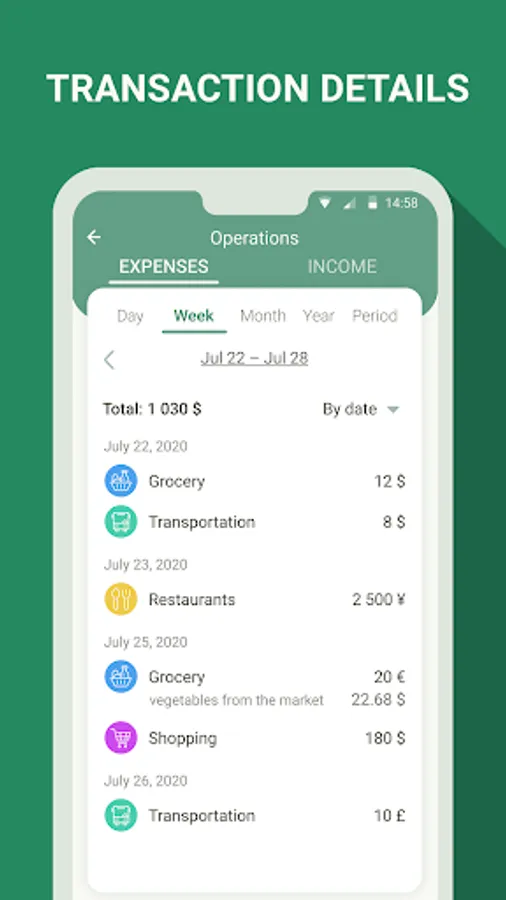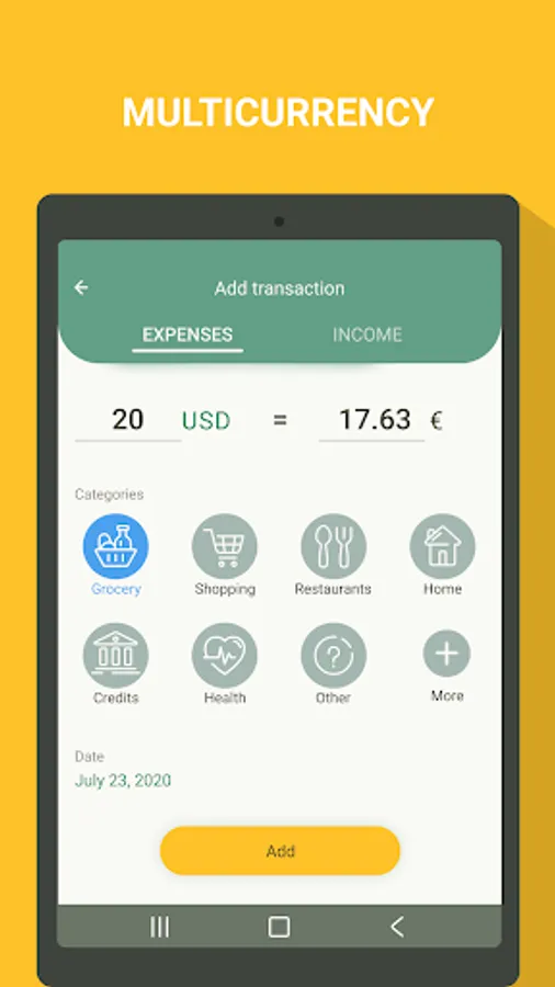 Use ready templates (such expenses as grocery, hobby, utility bills, etc.) or create your own categories, choose any colors and entitle them to adjust the app as you see fit and get the most out of it;
