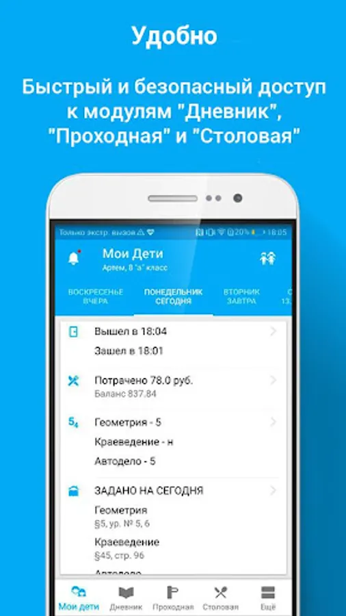 The "Argus.School" application allows you to control the modules: diary, checkpoint and canteen for the services "Innovative School", "School Card", "Road to School", "Modern School", "Kengu.Children", "SHKID" and "United city card "Together".