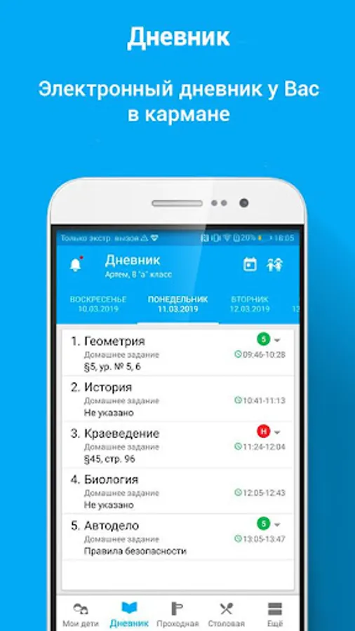 "Diary" is an analogue of an electronic school diary, where the following information is available to parents and children: class schedule, call times, lesson topics, homework and academic performance.