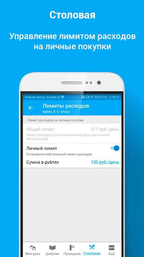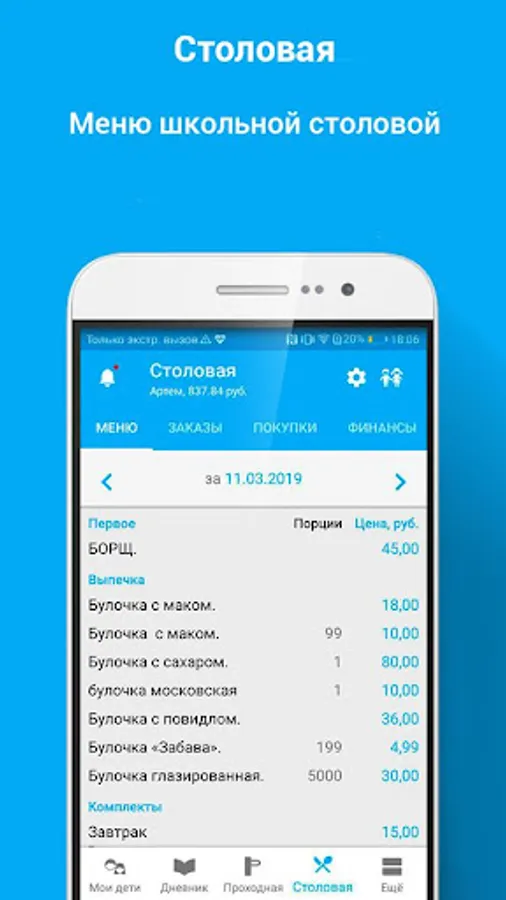 "Canteen" —parents and children will be able to view information about the school canteen and the school canteen: the menu that the child purchased, control the balance on the child's card, view information about the accruals of subsidies. Parents will be able to transfer money between their children's accounts.