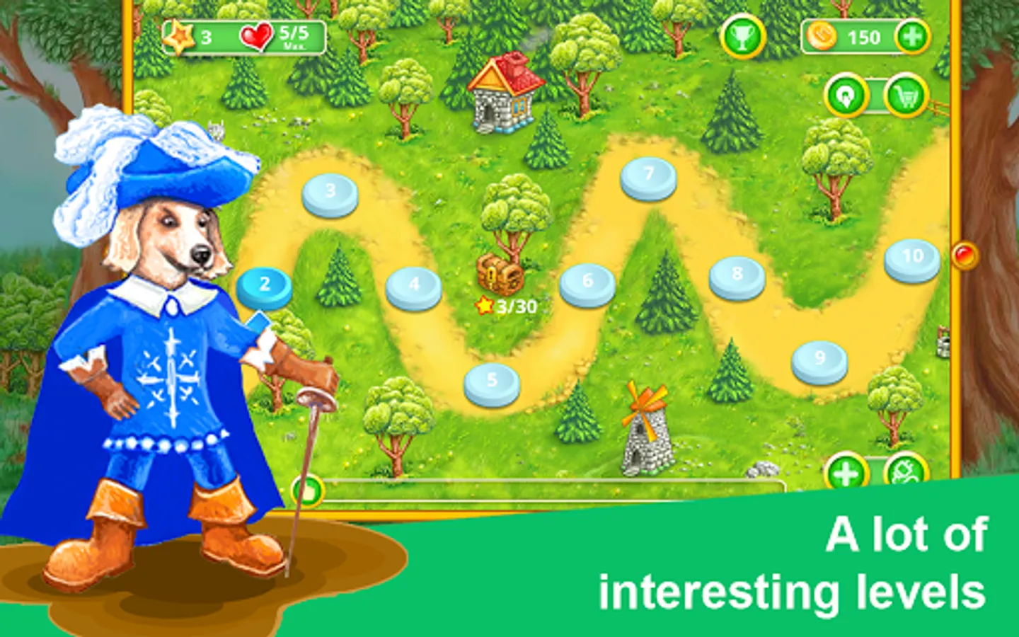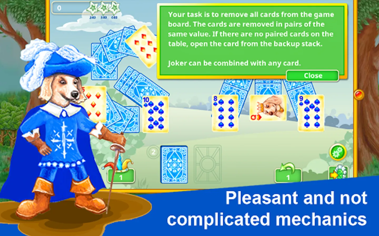 The game "Musketeers - solitaire pairs" - this classic card game, solitaire (solitaires). Contains a lot of exciting and exciting solitaire levels, each of which will clean the table, removing cards in pairs of equal dignity. The game starts with simple levels and gradually gets complicated. The level map is divided into episodes. To move from one episode to another, you need to type a certain number of stars. Each episode contains chests with coins, for the discovery of which you also need to collect stars.