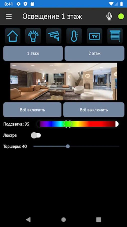 - selection of preset states of the selected devices and scenarios: for example, the "Security" mode activates motion sensors and preset security scenarios, the "Party" mode will set the required lighting, turn on the music.