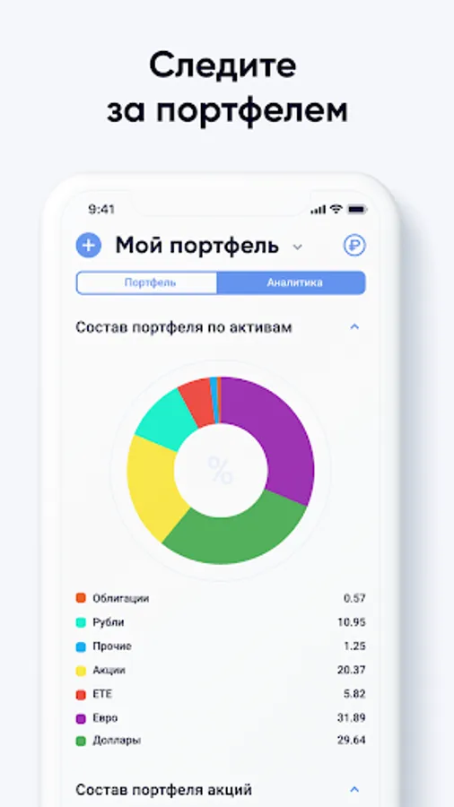 Use the application to view the performance of financial instruments: stocks, bonds, mutual funds (ETFs), precious metals, cryptocurrencies, currency pairs, create other assets. Stock quotes are updated through the world's leading stock exchanges: