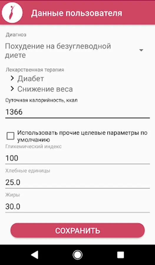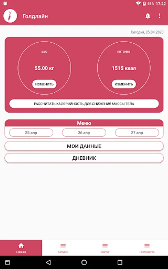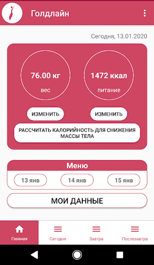 Goldline application will save you time and simplify the task if you decide to lose weight. The advantage over other applications is that you do not need to add products and their weight yourself, you do not need to calculate the calorie content required to reduce weight. The application will do everything for you, you just have to indicate the height, gender, weight, the presence of diseases associated with excess weight (if any) and drug therapy (if you are taking). All this will be taken into account when compiling the menu.