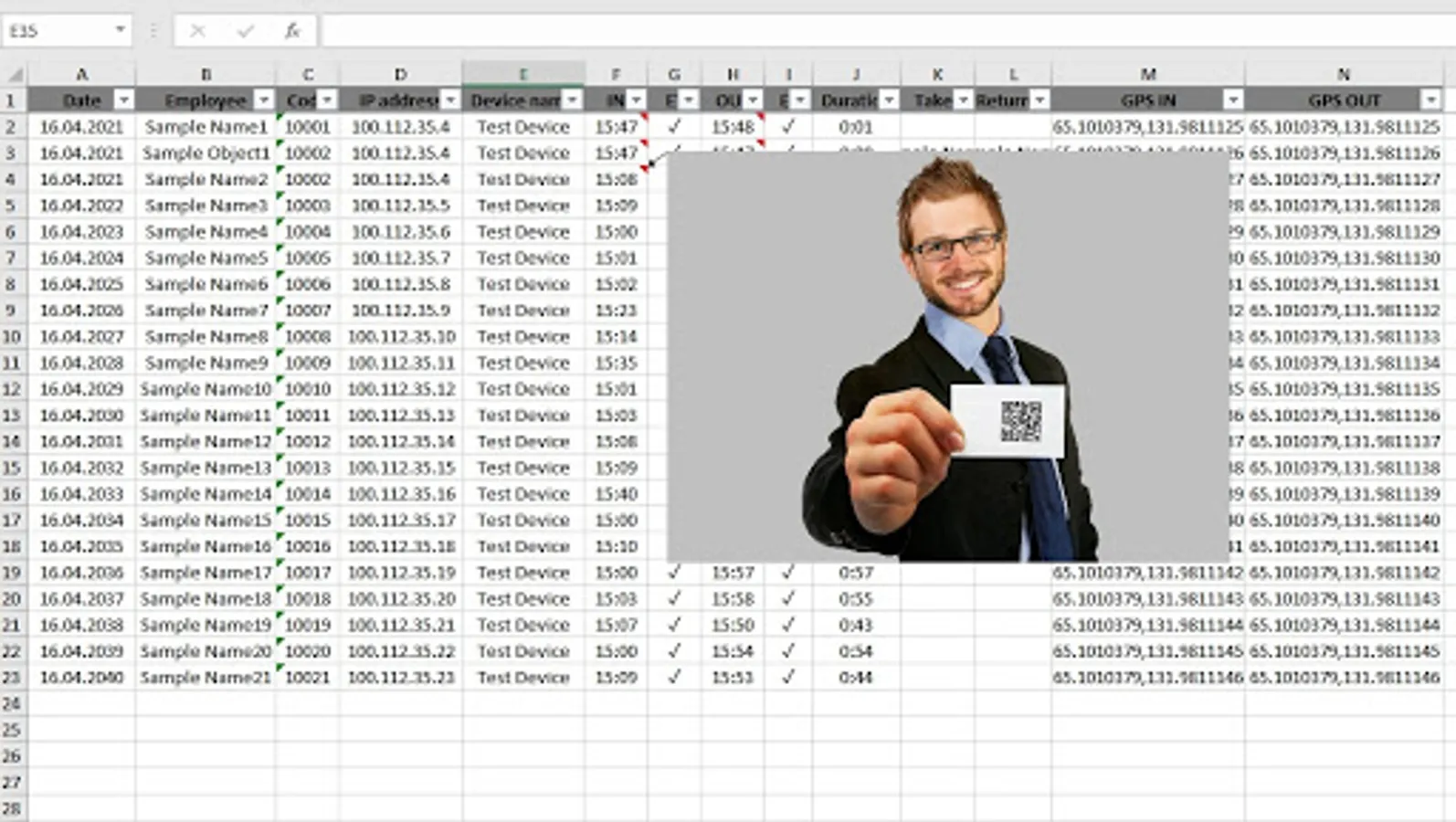 1) Automatic registration using camera by employee's QR- or barcode (Please check the template for printing cards here – just change the names or codes of employees).