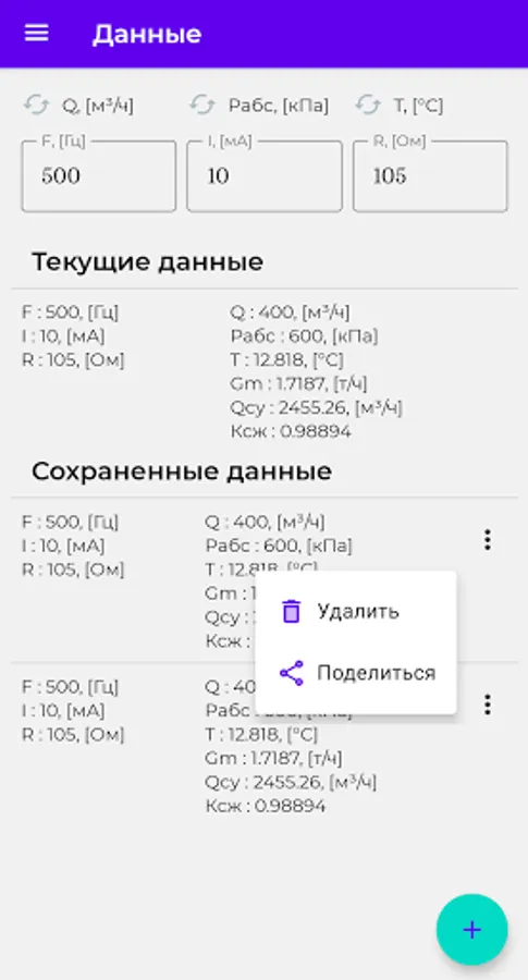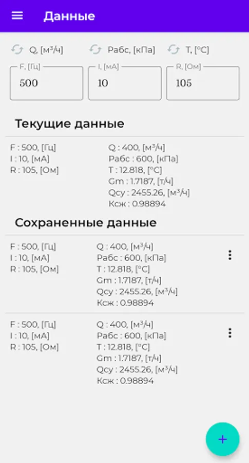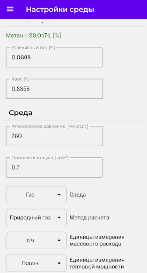 Application for calculating the compressibility coefficient of various gas media, steam / water parameters based on primary data from flow sensors, temperature, pressure.
