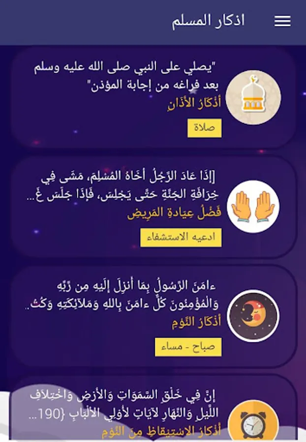 Remembrance of the Muslim application is a very important application through which you listen to read the entire Quran and arranged according to the wall, the application also contains a very large group of remembrances classified according to the type of dhikr and supplication, you can run the automatic reminder of mentioning where the application reminds you and shows the remembrance for each period according to your options.