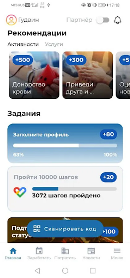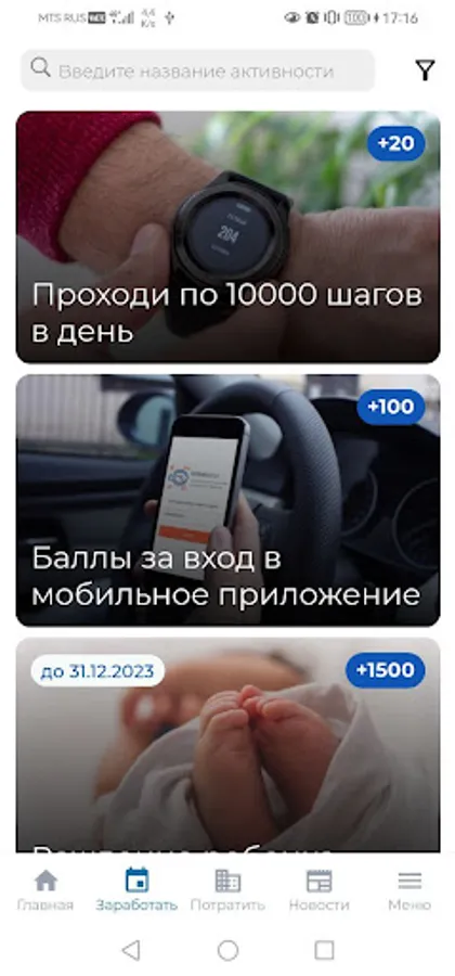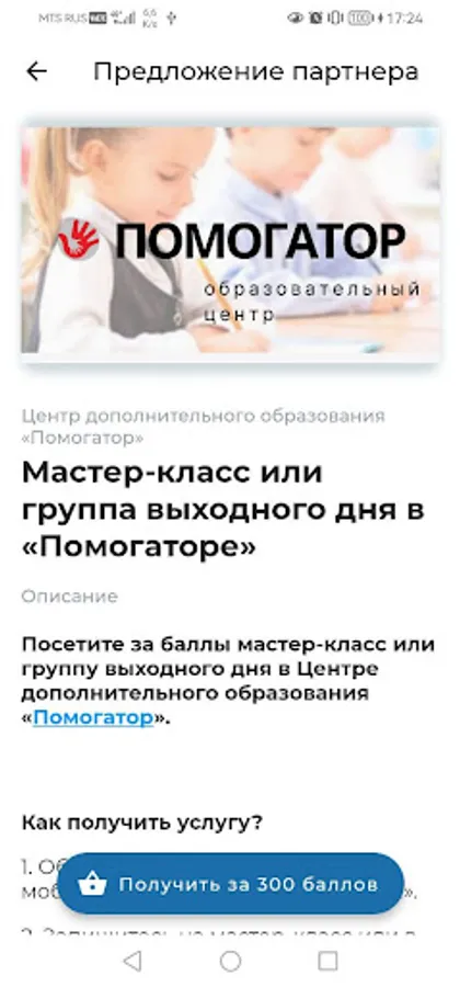 - a list of offers (discounts on goods and services) of the project partners, for which the user can exchange earned points,