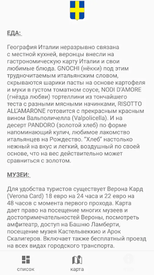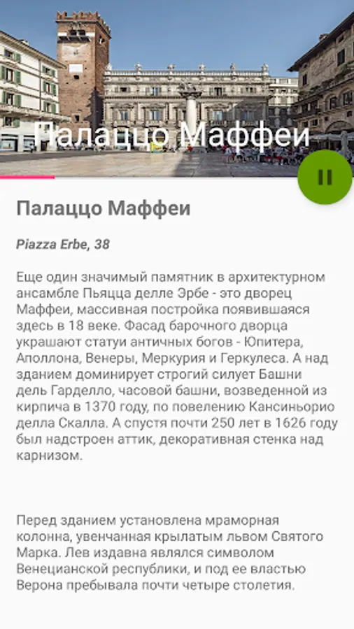A series of audio guides Italy can afford is simple, easy and convenient city guides Italy, which will introduce you to the main attractions of the city for 2-3 hours. This hiking with audio from a professional guide and advance the proposed route. The tour is built in such a way as to spend one day in the center of the city without the use of ground transportation. Ideal for a day in the city. Contains 22 points of the route in the center of the city. The app contains offline map with GPS support. All marked points of interest (point on the map) are sound and text description, and accompanied by photographs.