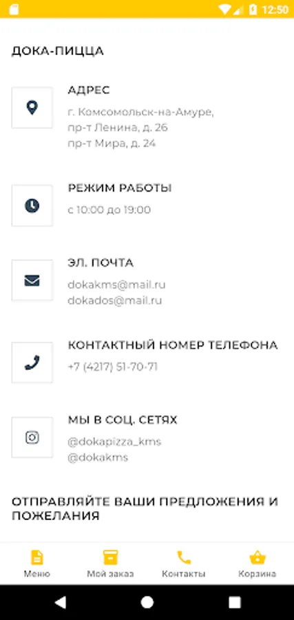 The official application provides an opportunity to place an order for delivery or self-pickup in one of the pizzerias of the Doka-Pizza chain in Komsomolsk-on-Amur