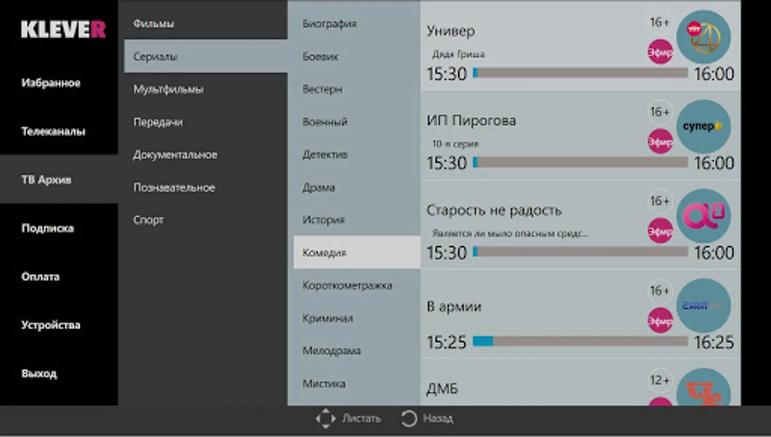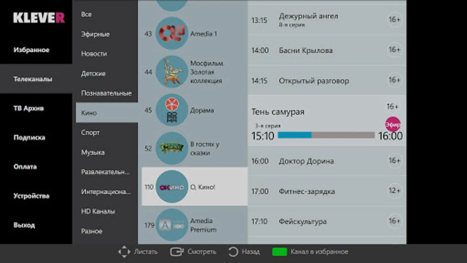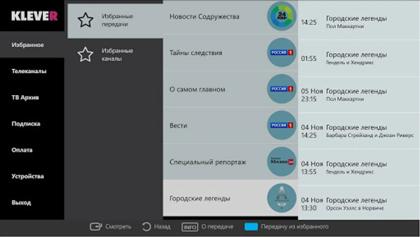 Please note: This app is for smart TVs and multimedia centers. It doesn't work on smartphones and tablets. For smartphones and tablets, we have a special version of the application - "KLEVER TV for smartphone"
