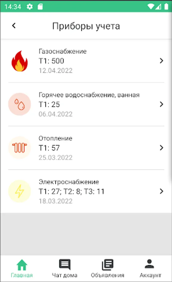 All individual metering devices are displayed in the application, you can transfer readings for the current month and see the history.
