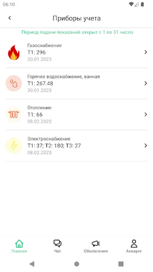 All individual metering devices are displayed in the application, you can transfer readings for the current month and see the history.