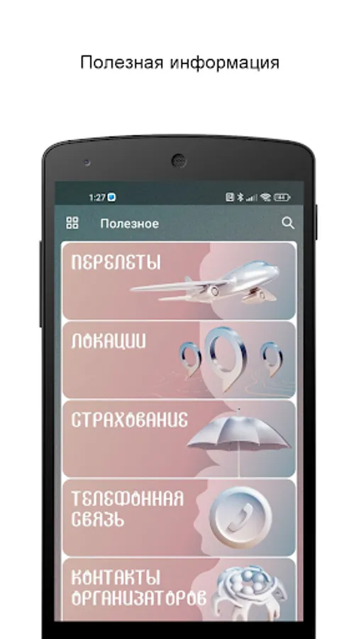 - useful information (flights, addresses, insurance, telephone, taxi services, event team contacts, money and payments in the country);