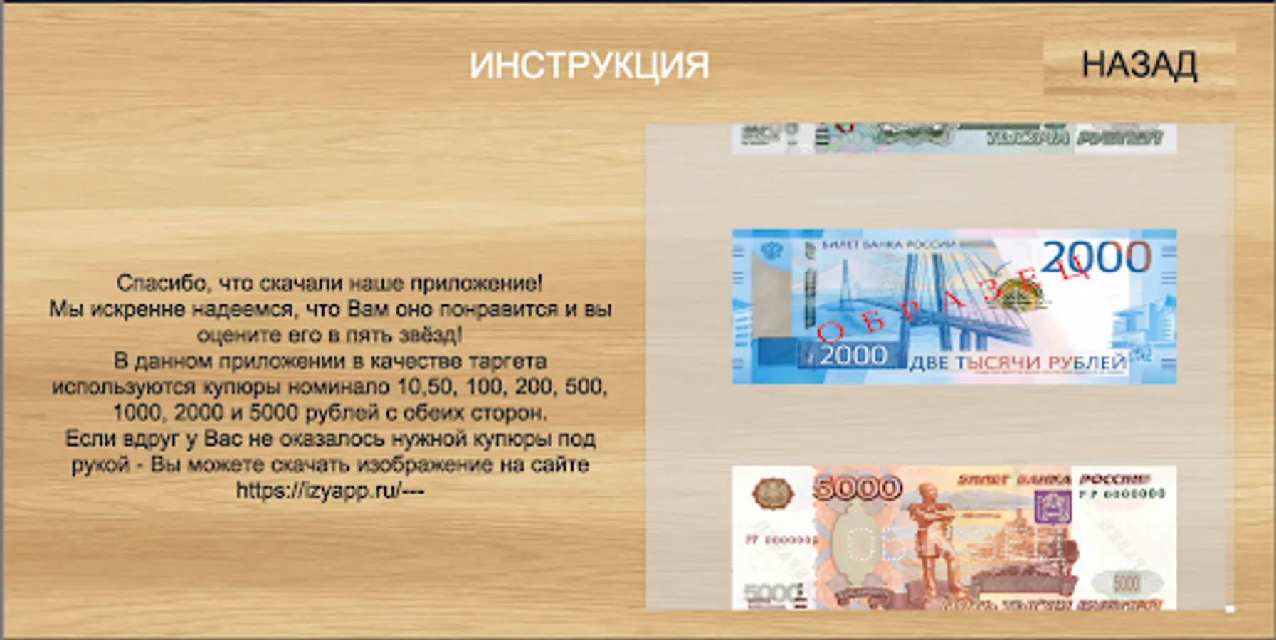 Images of the above bills are used as targets, but if suddenly you did not have them at hand, you can download images from the site https://izyapp.ru/ios-apps/banknotespro/ and enjoy the application)