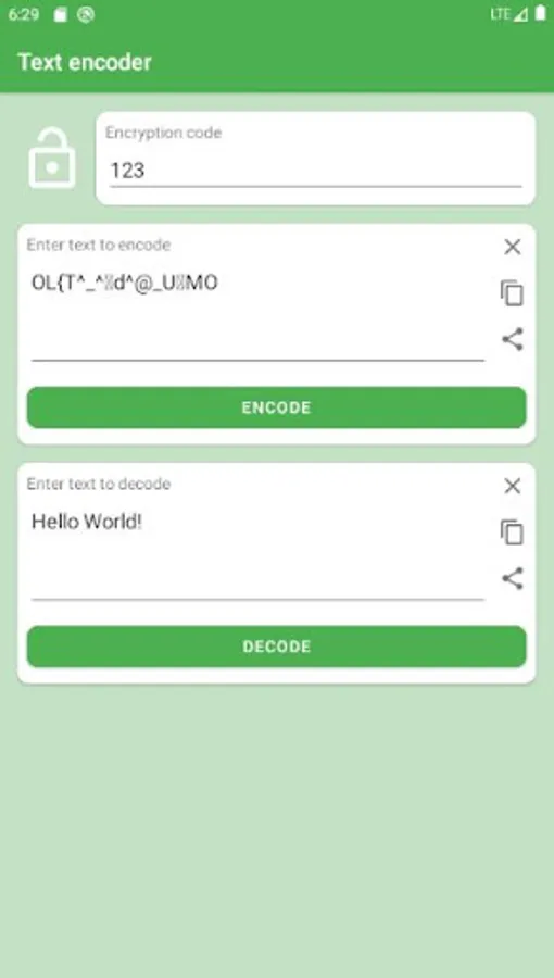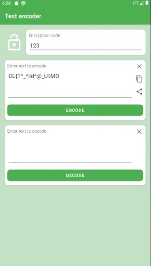 - On the second slide, the user presses the “ENCODE” button and the text is encrypted, the encryption is automatically copied to the clipboard and the share button on social networks becomes available.