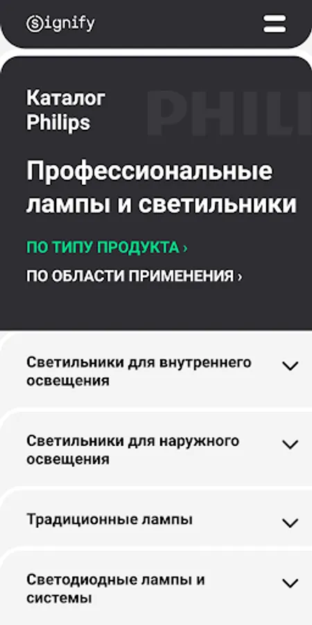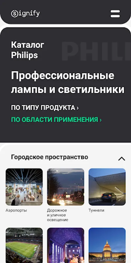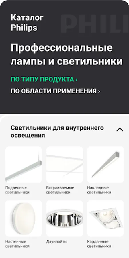 - select lighting for a specific application (for urban spaces, offices and industries, shops and hotels),