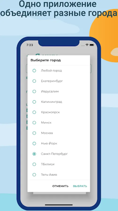 One application unites different cities (Moscow, St. Petersburg, Jerusalem, Tel Aviv, Minsk, Kiev, Tbilisi, Yerevan, Yekaterinburg, Krasnoyarsk, New York and others!)